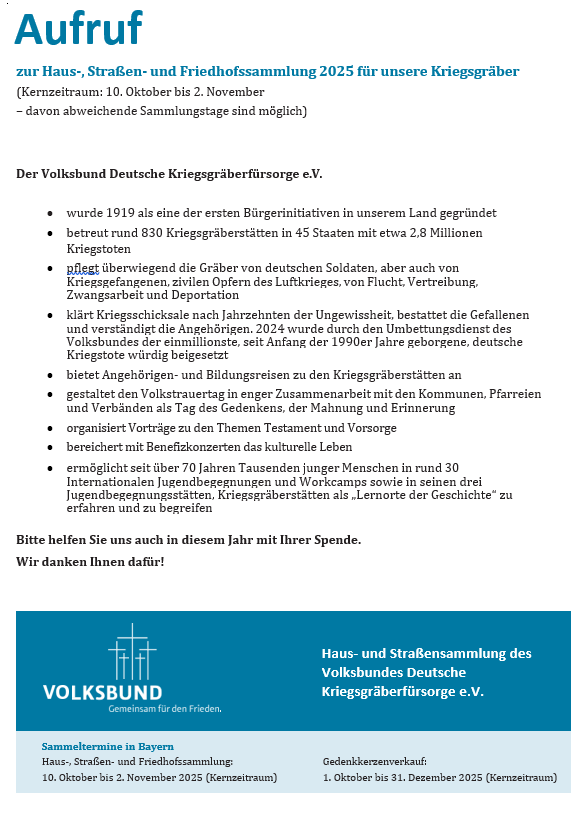 Der Landesverband Bayern des Volksbundes Deutsche Kriegsgräberfürsorge e.V. führt vom 10. Oktober bis zum 02. November 2025 wieder seine Haus-, Straßen- und Friedhofssammlung durch. Die Spenden unterstützen die Instandhaltung und den Bau der rund 830 deutschen Soldatenfriedhöfe mit etwa 2,8 Millionen Toten in aller Welt. Für seine Arbeit, die mit hohen Kosten verbunden ist, braucht der Volksbund dringend Geld. Damit die Sammelaktion auch in der Gemeinde Bodenkirchen zu einem Erfolg wird, werden freiwillige Hilfskräfte gesucht. Wer sich an der Haus-, Straßen und Friedhofssammlung 2025 beteiligen möchte, wird gebeten, sich in der Gemeindeverwaltung bei Herrn Maximilian Dennerl (Zimmer-Nr. 1 oder Tel.: 08745/968613) zu melden.